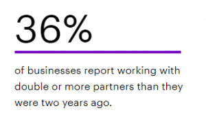Technology partnerships and “frictionless business” have been highlighted by Forbes and have been a fixture on Accenture’s annual technology trend reports since 2018. Accenture highlights survey results where 36% of businesses report working with double or more partners than they were two years ago.
