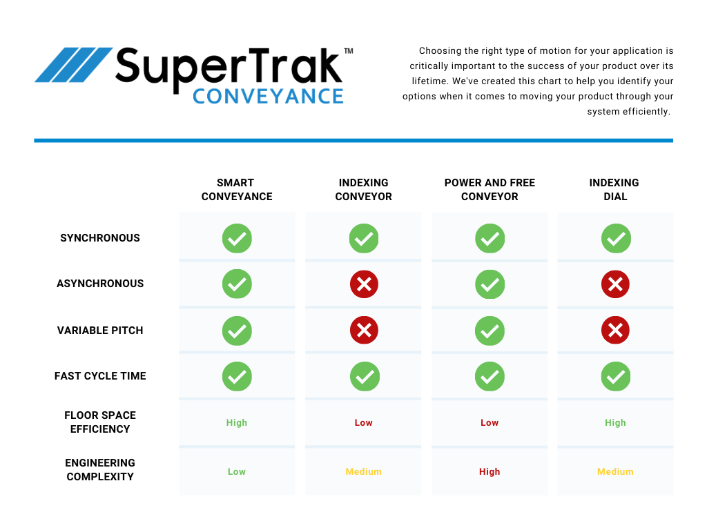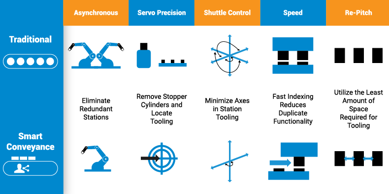 To gain a better understanding of the differences between traditional and Smart Conveyance, let us review how each impacts motion, footprint, process, OEE, and data.