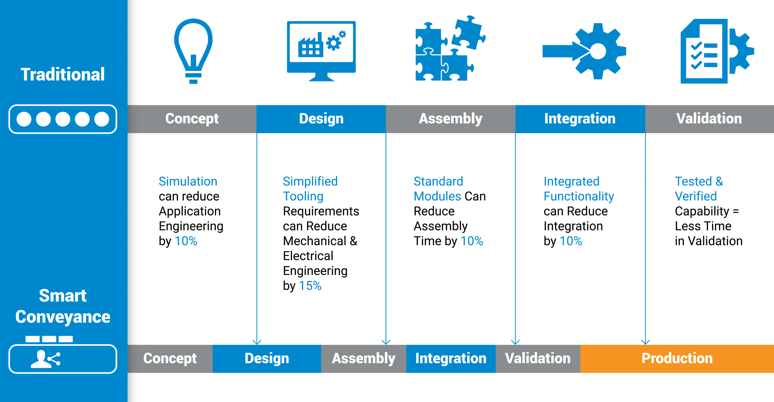 Smart Conveyance empowers machine builders to move their projects from concept to assembly to production up to 45% faster than with traditional conveyance, with simplified tooling, reduced floorspace, and an overall reduction in engineering hours.